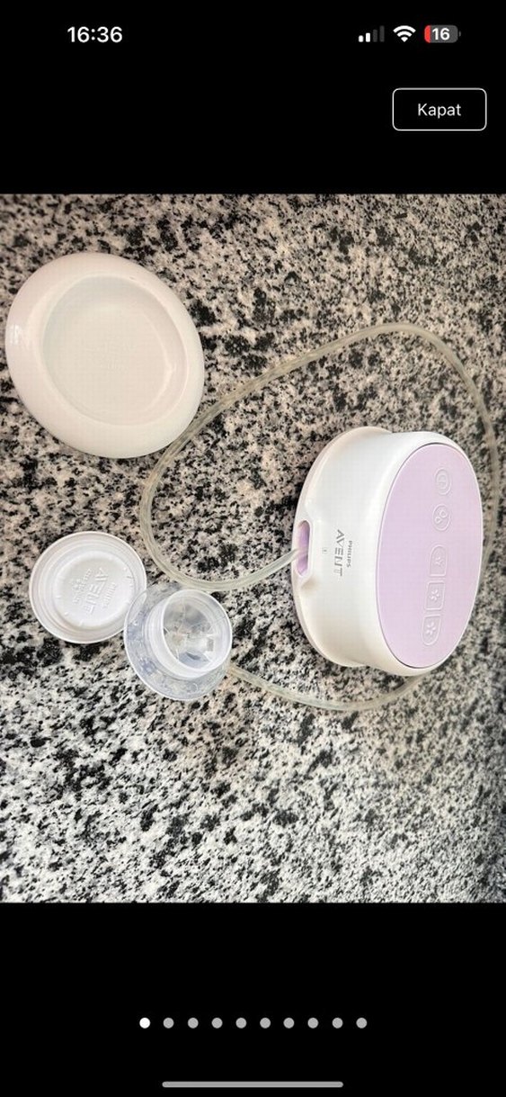 Philips Avent göğüs pompası, gri ve beyaz parçalarla. Konforlu kullanım için emzik ve hortum içerir. Basit kontrol düğmelerine sahiptir.