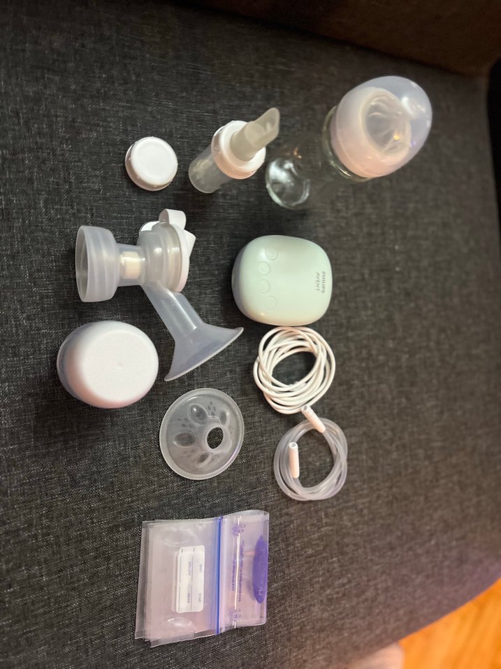 Beyaz ve gri renklerde, çeşitli aksesuarlarla birlikte gelen göğüs pompası seti. Philips Avent Essentials Tekli Elektrikli Göğüs Pompası SCF323/11 Çok az kullanılmıştır.