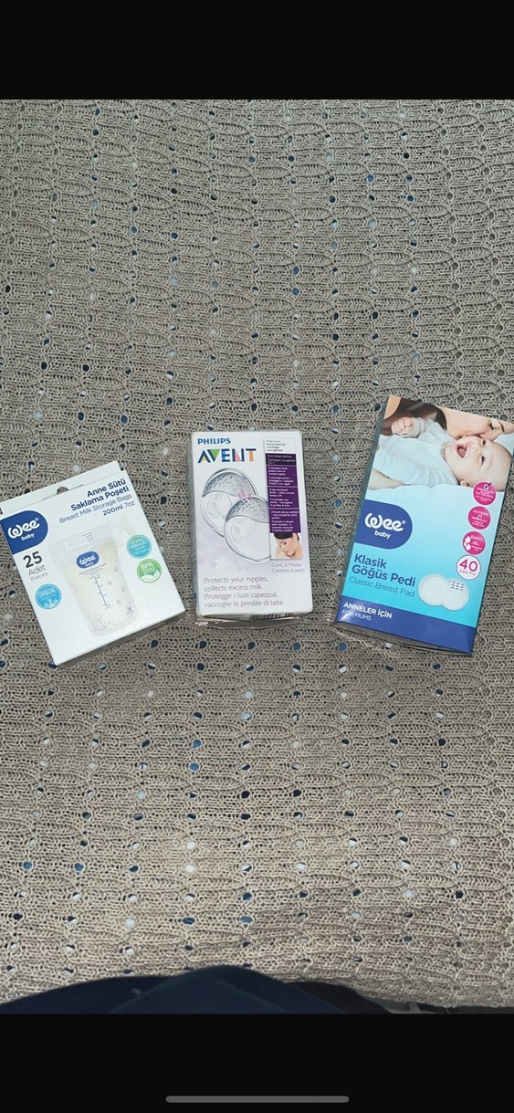 Wee baby süt saklama poşeti hiç kullanılmadı. Philips avent göğüs kalkanı hiç kullanılmadı sadece siteril edildi.beklemeye bağlı sararma mevcut Wee baby göğüs pedi hiç kullanılmadı.