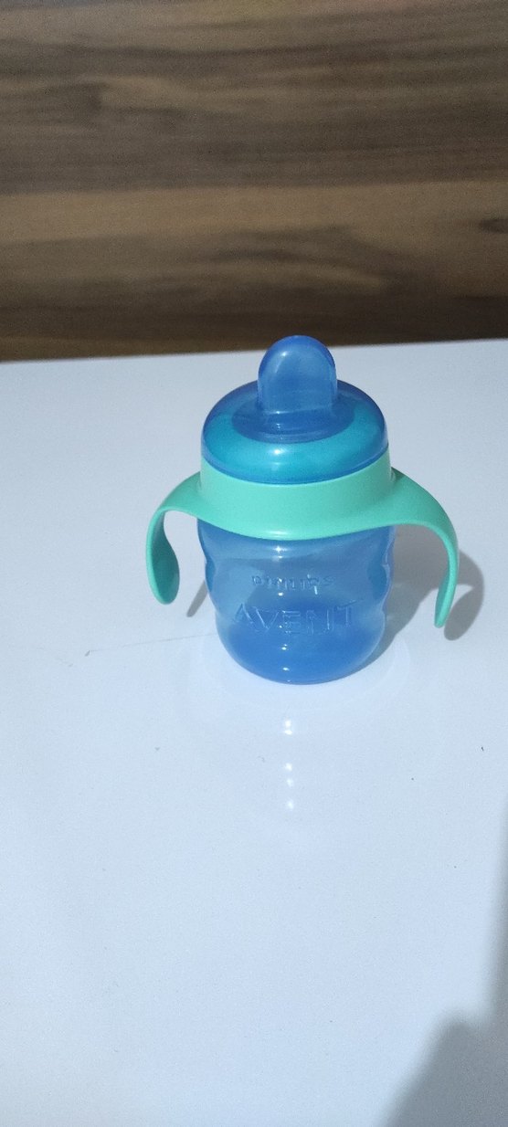 Philips Avent Mavi renkli bebek suluğu, tutma saplı ve yumuşak emzikli, renkli tasarıma sahip.