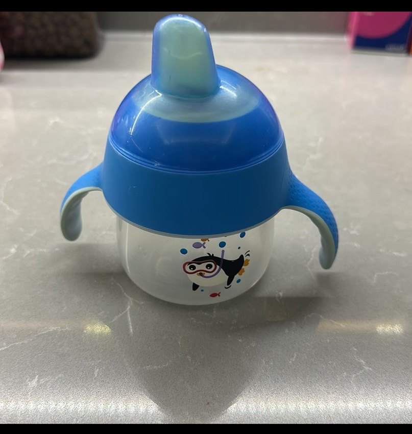 Mavi kulplu bebek suluk, renkli su altı temalı desenli ve hijyen için kapaklı emzikli.