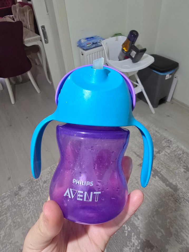 Philips Avent mor renkli, mavi kulplu bebek biberonu, kolay tutuş ve kullanım sağlar. fotografta gorundugu gibidir pipetin ucu ısırılmış ama yinede cocuklar içebiliyor yada ben icine meyvesuyu pipeti takiyordum oyle kullanjyolardi .;))