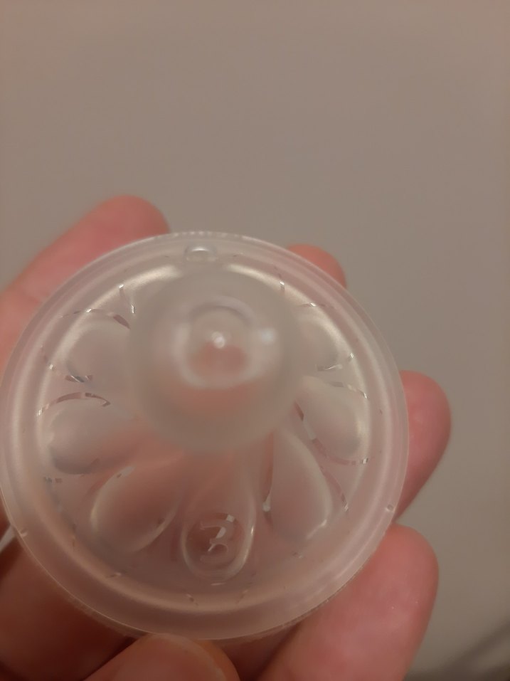 Yumuşak malzemeden yapılmış, rahat besleme için bej renkli bebek biberonu emziği. 3 numara .az kullanılmış