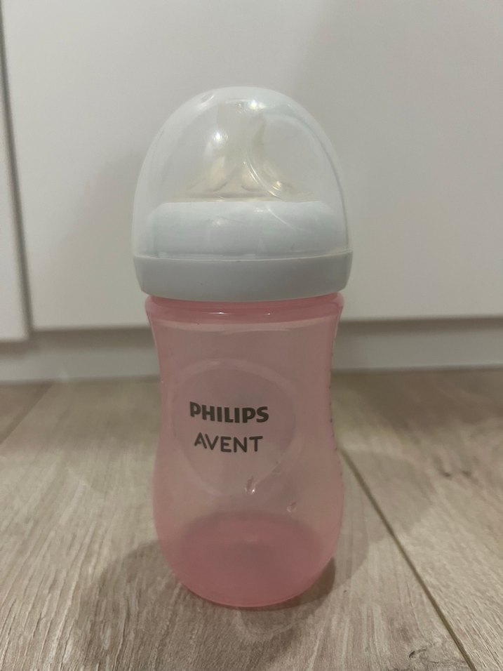 Philips Avent bebek biberonu, pastel pembe renkte ve şeffaf kapaklıdır. Rahat kullanım için tasarlanmıştır.