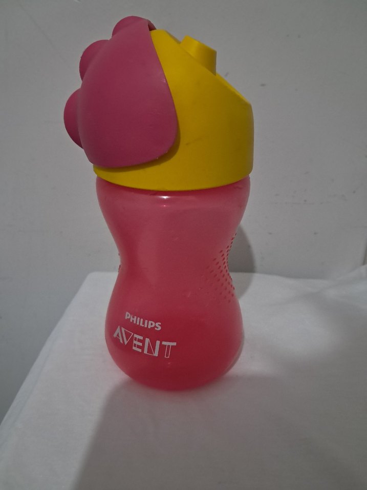 Philips Avent pembe renkli, kolay tutuş sağlayan sarı ve pembe renkli kapaklı bebek suluğu. pipet kısmı zamanla deforme olduğu için attık onun dışında tam