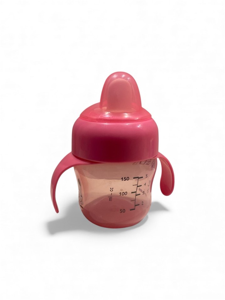 Pembe renkli, ölçü işaretli ve tutma kulplu bebek biberonu.