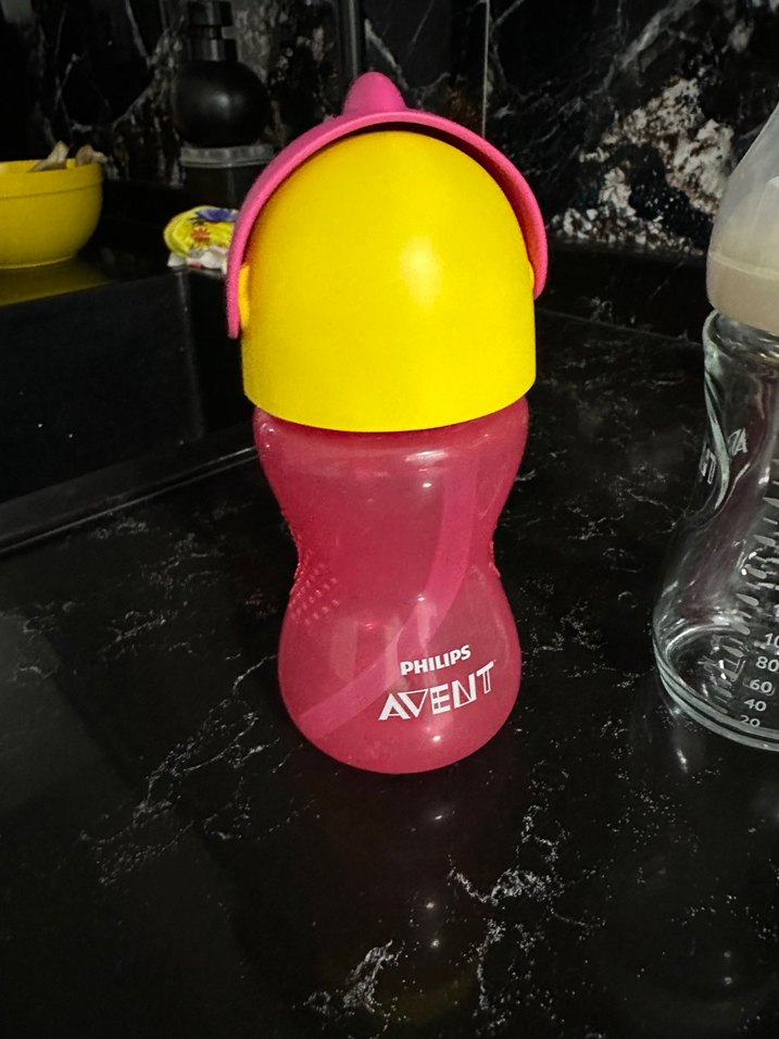 Philips Avent markalı, pembe gövdeli ve sarı kapaklı renkli bebek biberonu, rahat tutuş sağlar.