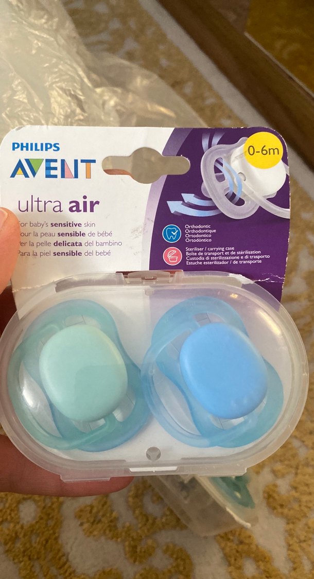 Philips Avent Ultra Air emzikler, 0-6 ay arası bebekler için, hassas ciltlere uygun, pastel mavi renkte. Sterilizasyon ve taşıma kutusu içerir.