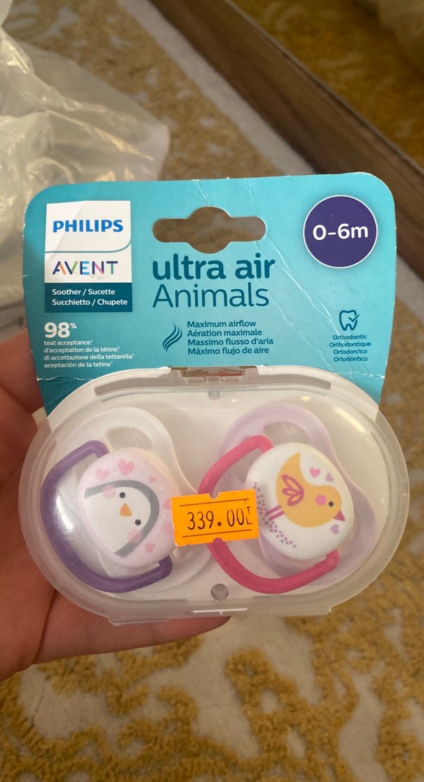 Philips Avent Ultra Air emzik, 0-6 ay arası bebekler için hayvan desenli ve maksimum hava akışı sağlar. Ortodontik şekildedir. Pastel pembe ve mor renklerde.
