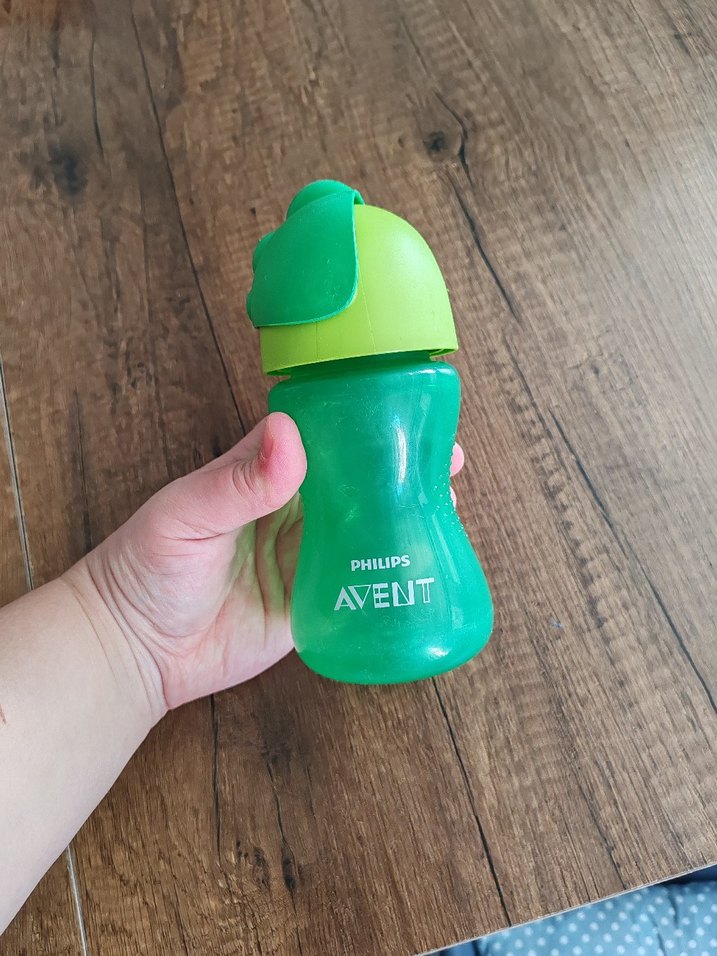 Renkli yeşil Philips Avent bebek biberonu, güvenli kapak ve kolay tutuş için ergonomik tasarıma sahiptir. Ucu hasarlıdir