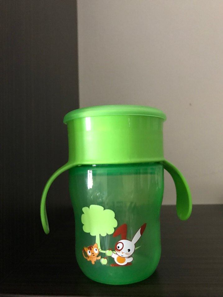 Philips Avent Kulplu yeşil bebek çocuk sızdırmaz bardak , üzerinde ağaç, tavşan ve kedi desenleri bulunan renkli tasarım. Kolay tutuş sağlar.
