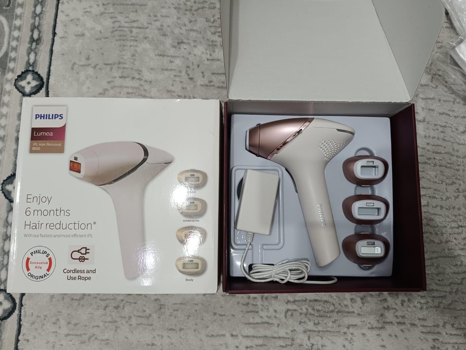 Philips markalı, bej renkli lazer epilasyon cihazı. Vücut ve koltuk altı için farklı başlıklar ve güç adaptörü içerir. SINIRSIZ ATIŞ ORJİNALDİR