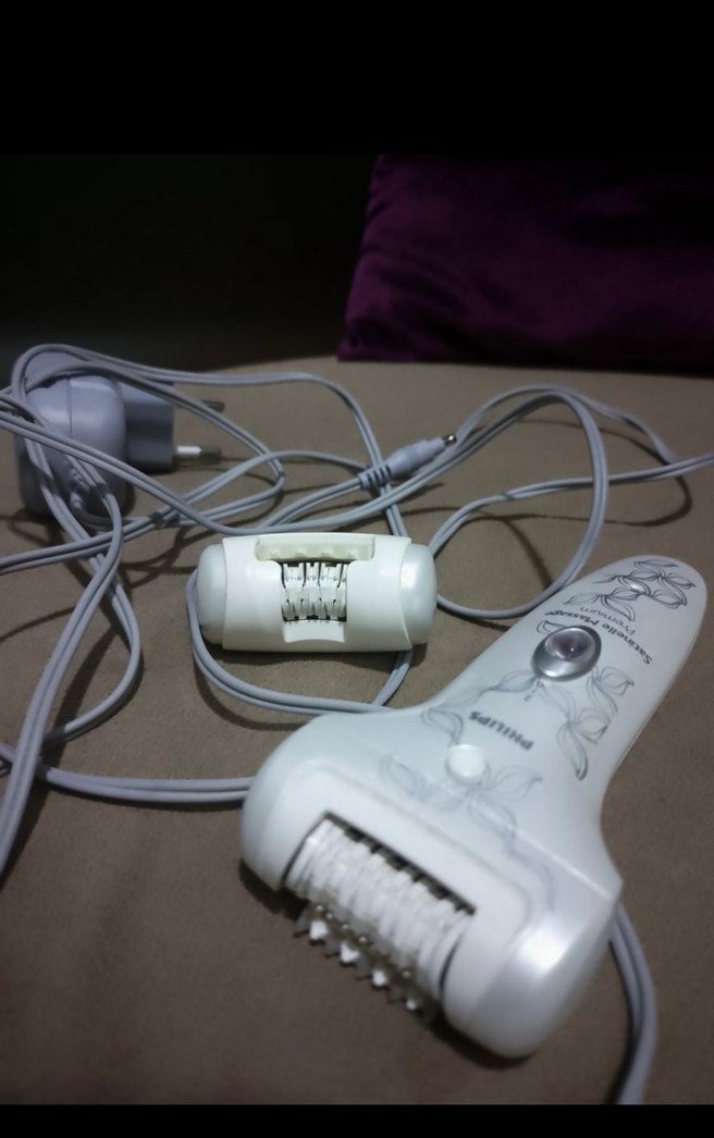 Philips markalı beyaz ve gri renklerde, etkili tüy alma için çoklu başlıklı kablolu epilatör.