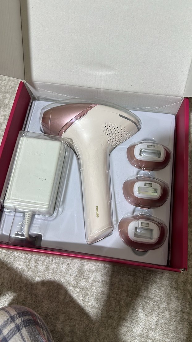 Philips beyaz lazer epilasyon cihazı, üç değiştirilebilir başlık ve güç adaptörü ile birlikte gelir. ✨