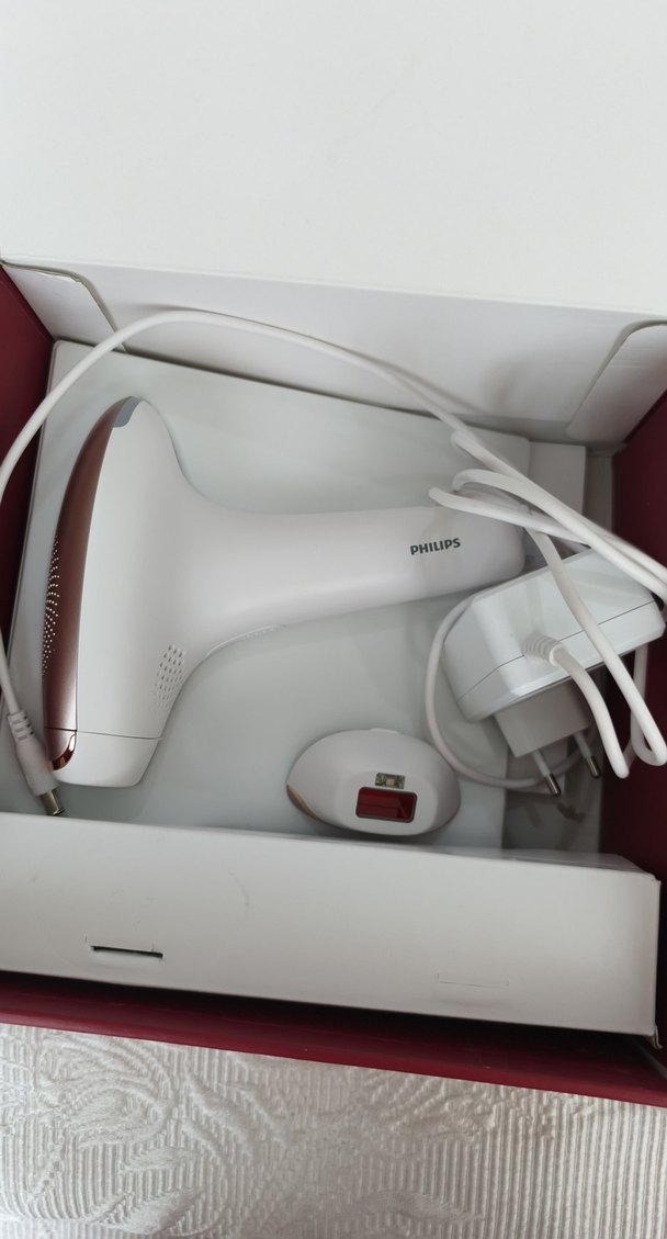 Philips marka beyaz lazer epilasyon cihazı, güç adaptörü ve ekstra başlık ile birlikte. Hafif tasarıma sahiptir. ⚡