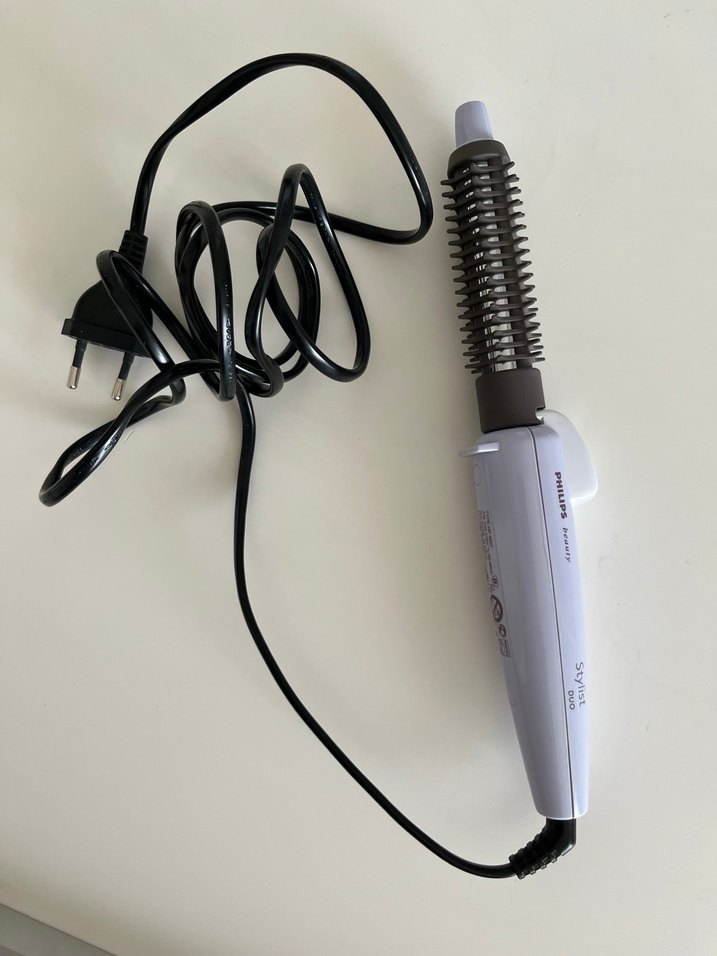 Philips marka beyaz ve gri saç şekillendirici, yuvarlak fırça başlığı ve uzun siyah kablosu ile saçları şekillendirmeye uygundur. ✂️