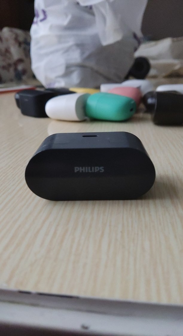 Taşınabilir ve kullanışlı siyah Philips kablosuz kulaklık ve kompakt şarj kutusu.