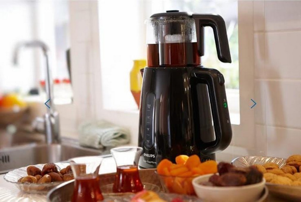Koyu kahverengi Philips çay makinesi, siyah taban ve saplı cam demliği ile pratik çay demleme sağlar. ☕ SİFİR PAKETLİ HİC KULLANİLMADİ EV HEDİYESİ GELDİ. GARANTİSİ BASLATİLMADİ