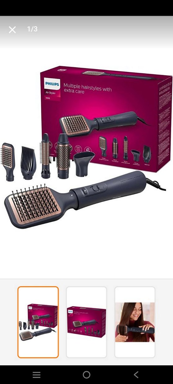 Philips saç şekillendirici seti, çeşitli saç stilleri için çoklu başlıklar ve ekstra bakım sunar. Koyu kahverengi renkte, farklı tarak ve fırçalar içerir. ♀️