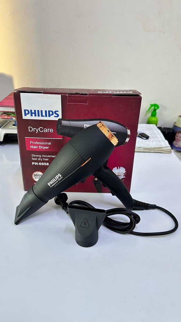 Philips 9000 watt DryCare PH-6958, hızlı kurutma için güçlü hava akışına sahip profesyonel saç kurutma makinesidir. Konsantre edici başlık ve siyah gövde üzerinde renkli detaylara sahiptir. ♀️