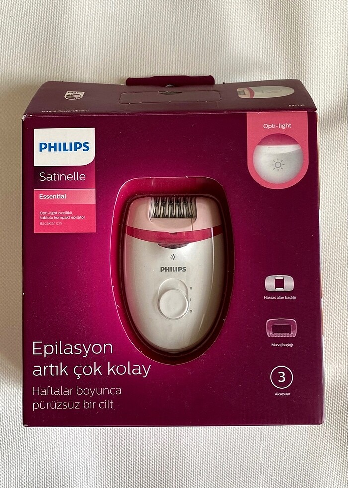 Philips BRE255/05 Satinelle Essential Kablolu Kompakt Epilatör Daihili ışık mevcut Tüyleri kökünden alan sistemi mevcut Hassas başlık mevcut Masaj başlığı mevcut 2 kademeli hız ayarı var Ergonomik tutuş Yıkanabilir başlıklı Seyahat çantası var Not: Ürün bir iki kez kullanıldı lazere başlayınca kullanmadım (Hassas başlık ve masaj başlığı hiç kullanılmadı) Garantisi hala devam ediyor