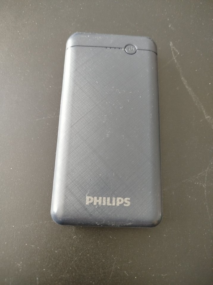 Üstte güç düğmesi bulunan, taşınabilir şarj için uygun Philips gri power bank.