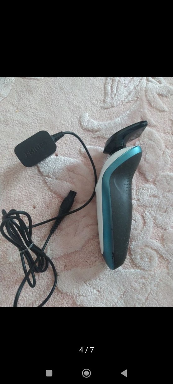 Philips marka, turkuaz ve gri renkte ergonomik tasarımlı şarjlı tıraş makinesi ve şarj cihazı ile birlikte.