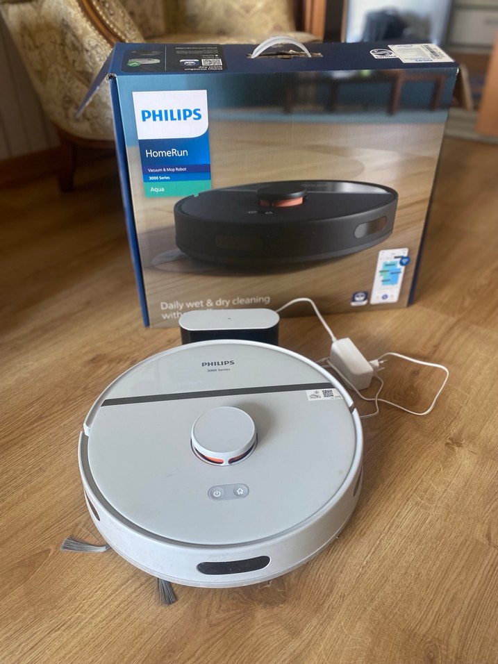 Philips HomeRun beyaz ve gri renkli robot süpürge, günlük ıslak ve kuru temizlik sağlar. Şarj istasyonu ve uzaktan kumanda dahildir. 9 aylık ürün tertemiz hiçbir sorunu yoktur. Media Markt tan alındı garantisi devam etmektedir.
