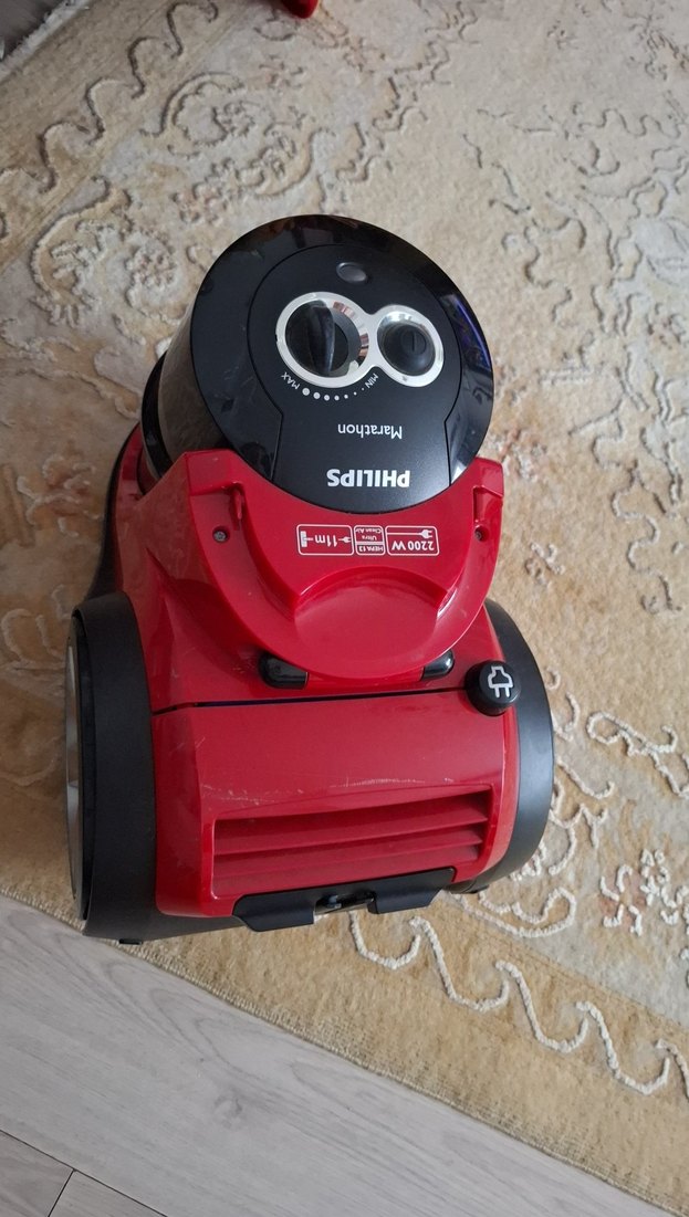 Philips kırmızı elektrikli süpürge, 1300W motor ve ayarlanabilir emiş gücü ile etkili temizlik sağlar. Renkli tasarım ve dayanıklı tekerlekleri vardır.