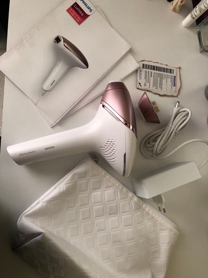 Philips Lumea beyaz lazer epilasyon cihazı, şık tasarım ve açık pembe detaylar içerir. Güç kablosu, koruyucu kapak ve beyaz taşınabilir çanta dahildir. Garantisi devam ediyor yaklaşık 15 ay vardır hediye geldi toplasam 5 6 kez kullandım zamanım olmuyor değerlendirmek istedim