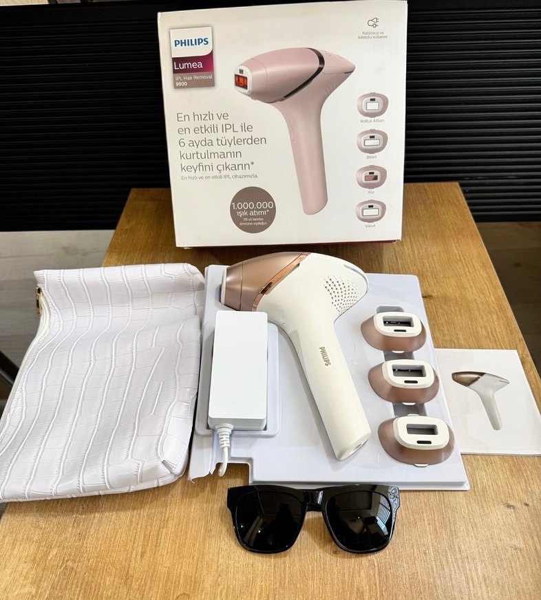 Philips Lumea IPL lazer epilasyon cihazı 6 ayda etkili tüy azaltımı sağlar. Konforlu kullanım için çeşitli başlıklar ve koruyucu gözlük dahildir. ✨