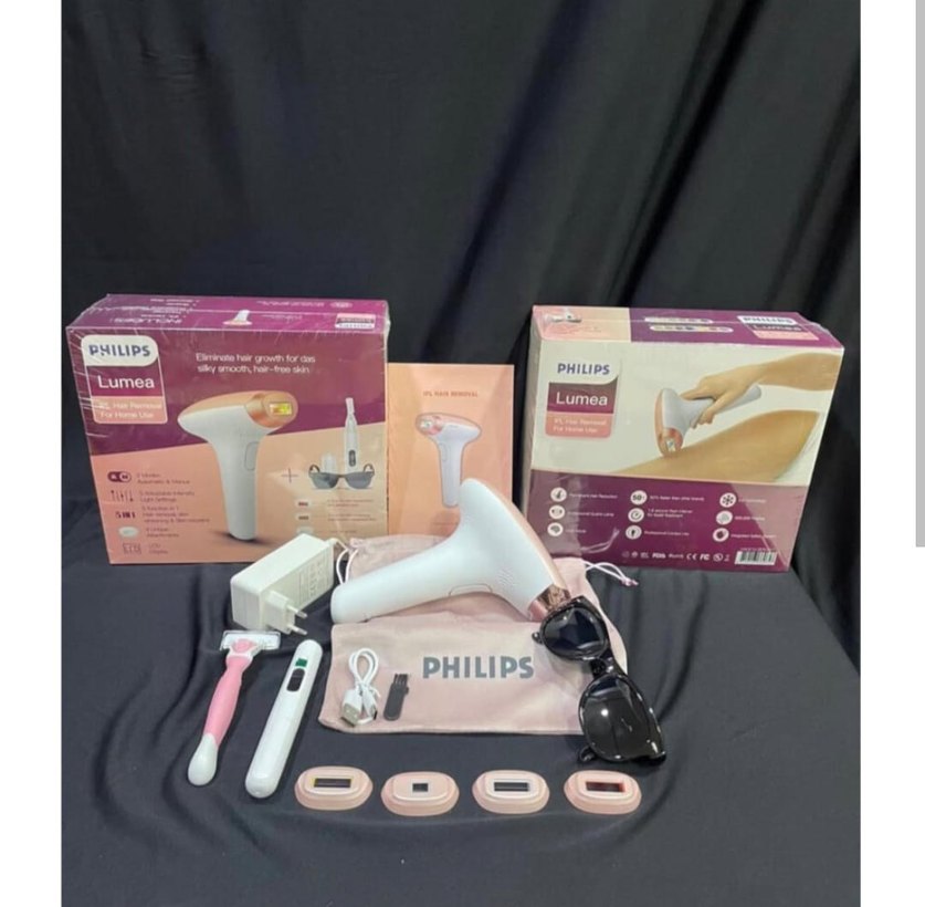 Philips Lumea IPL lazer epilasyon cihazı beyaz renkte, çeşitli başlıklar, şarj kablosu, koruyucu gözlük ve ek aksesuarlarla birlikte gelir. SINIRSIZ ATIŞ