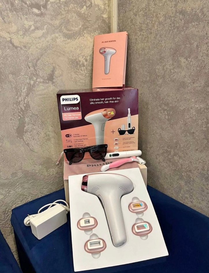 Philips Lumea IPL lazer epilasyon cihazı, dört değiştirilebilir başlık ve koruyucu gözlükle birlikte gelir. Beyaz renkli, etkili tüy alma sağlar.