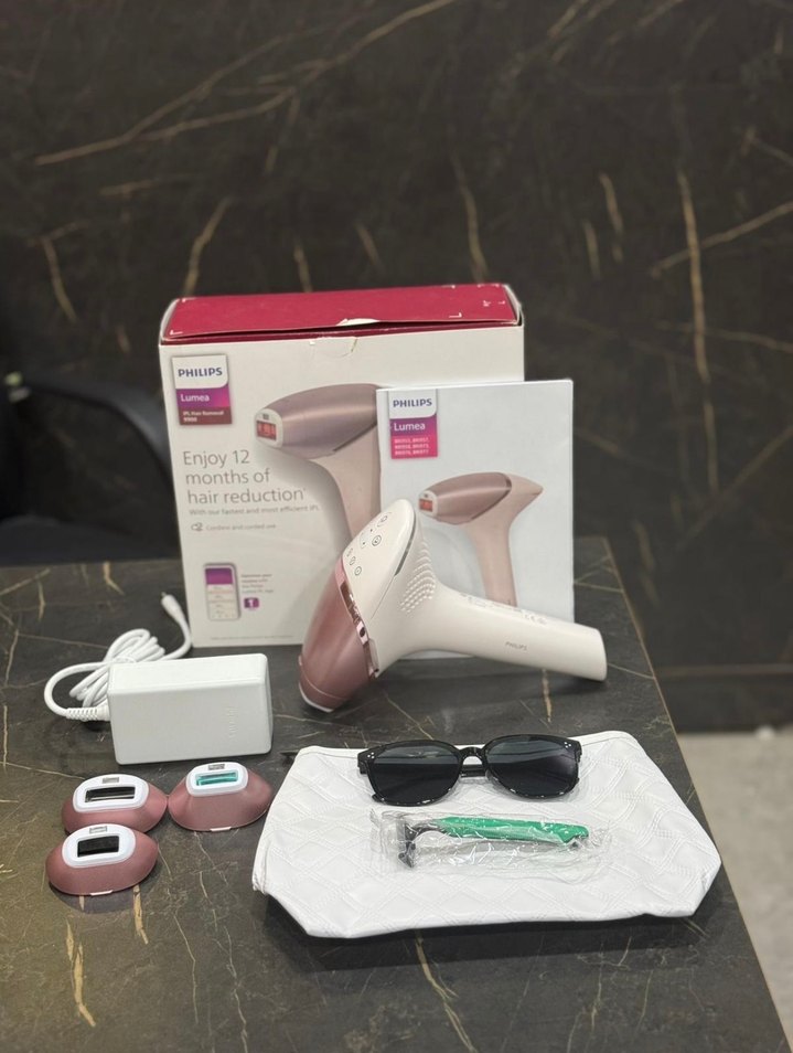 Philips Lumea IPL cihazı, farklı vücut bölgeleri için üç başlık, beyaz şık tasarım ve kolay kullanım sunar. Adaptör, gözlük ve tıraş bıçağı ile birlikte gelir.