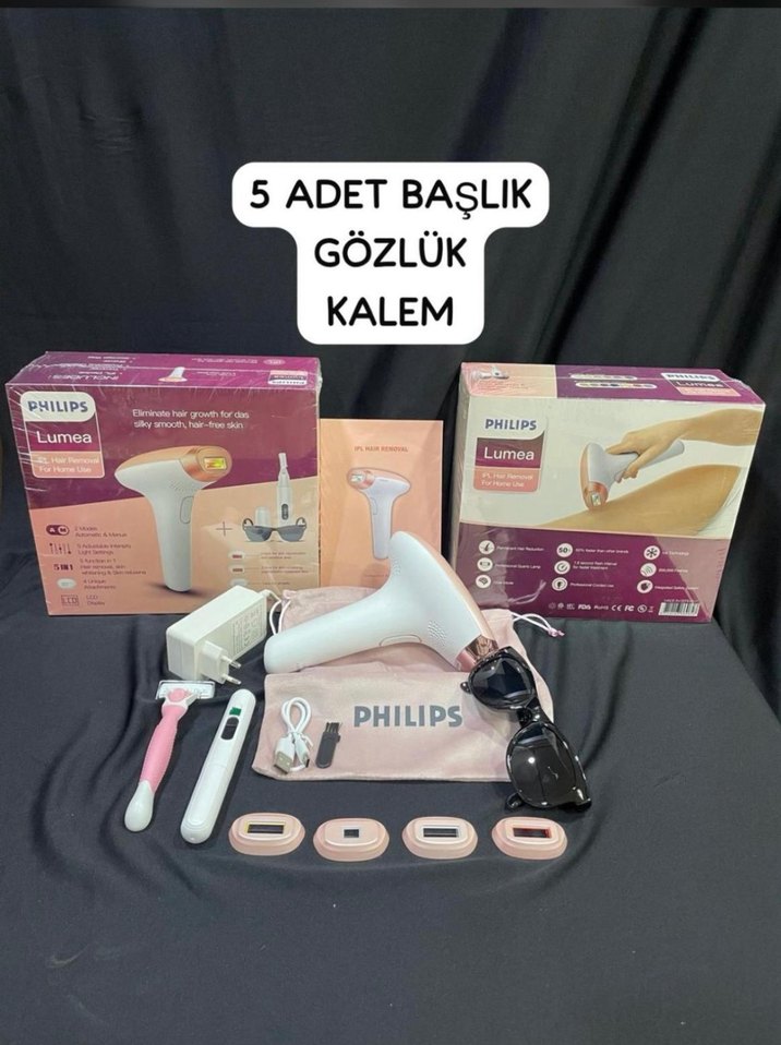 Philips Lumea pembe lazer epilasyon cihazı 5 adet başlık, koruyucu gözlük ve hassas kullanım için kalem içerir. Çok yönlü başlıklarla etkili tüy azaltma sağlar.