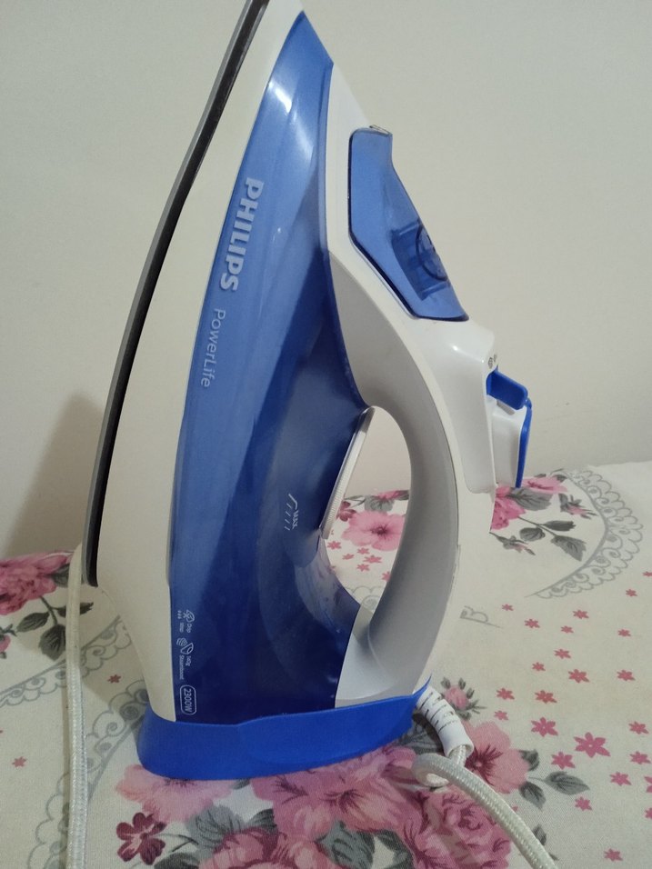 Philips markalı, açık mavi renkli buharlı ütü, ergonomik tutma yeri ve su haznesi ile ütü yapmayı kolaylaştırır.