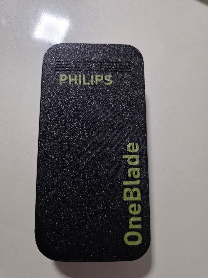 Siyah zemin üzerine haki renkte marka yazısına sahip, kompakt tasarımlı Philips OneBlade kutusudur. Seyahat için veya ürün muhafaza için uygundur.