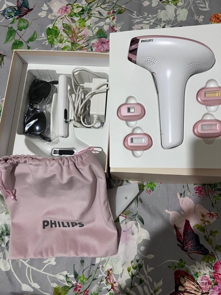 Philips pembe lazer epilasyon cihazı, farklı başlıklar, şarj kablosu, koruyucu gözlük ve saklama çantası ile birlikte gelir. Evde pratik kullanım sağlar. Bir kere yüz için kullanıldı bir milyon atışa sahip kullanılan atışlar görselde mevcuttur