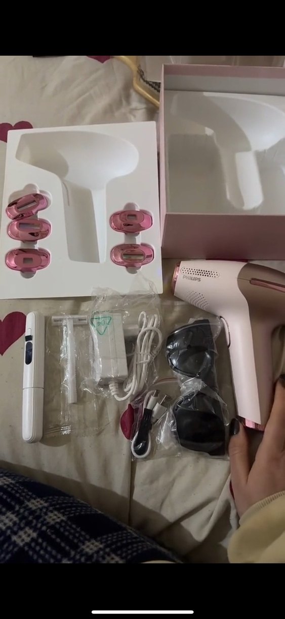 Philips pembe lazer epilasyon cihazı, çeşitli başlıklar, güç adaptörü ve koruyucu gözlüklerle birlikte gelir. Açık pembe renk.