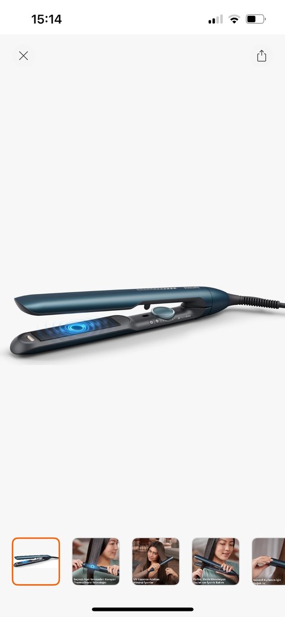 Koyu mavi renkte saç düzleştirici, ayarlanabilir ısı ayarları ve kolay kullanım için döner kabloya sahiptir. Saç şekillendirmede pratiktir. Yeni gibi bir iki kez kullanıldı yenisini aldığım için satıyorum