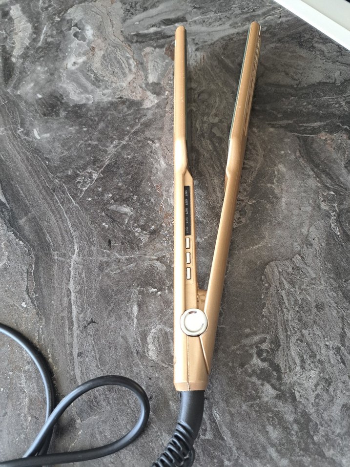 Parlak bej renkte saç düzleştirici, ayarlanabilir ısı ayarları ve kullanımı kolay döner kabloya sahiptir.Yurt dışında alındı