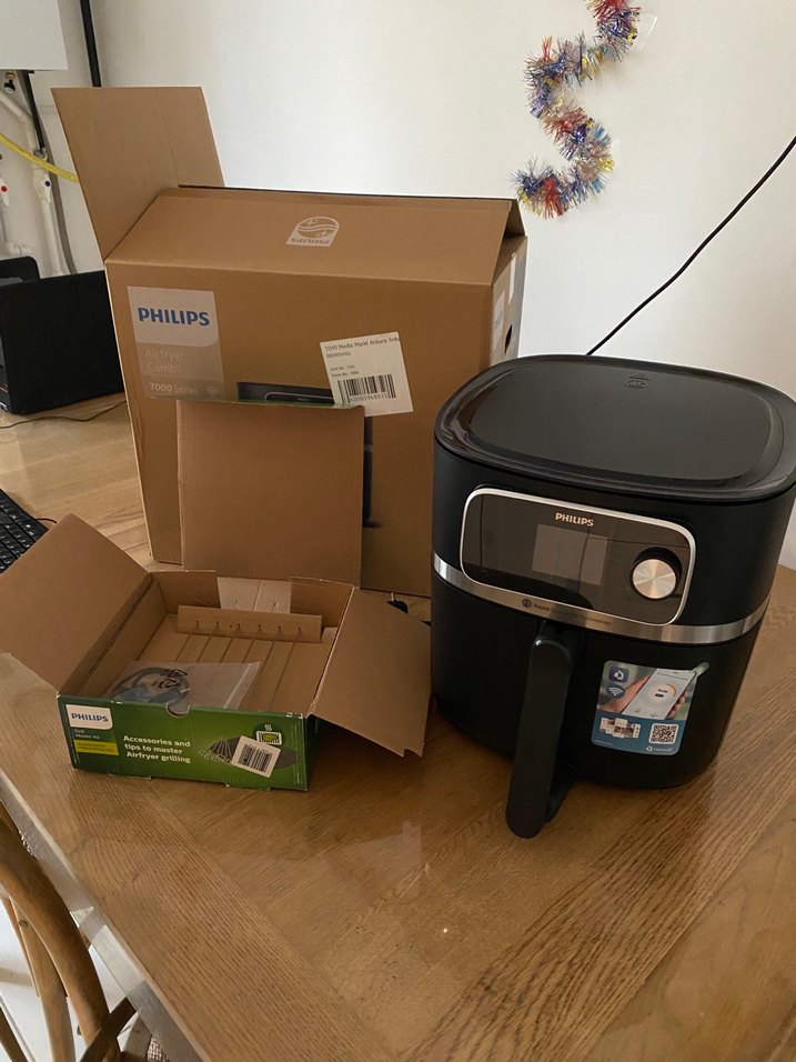 Philips siyah dijital hava fritözü, kolay kullanım için dijital kontrol paneli ve şık koyu tasarıma sahiptir. Ürün sıfır hiç kullanılmadı.