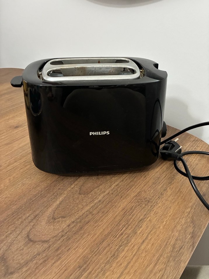 Philips marka siyah ekmek kızartma makinesi, iki dilim ekmek için uygun kompakt tasarıma sahiptir. Kolay kullanımlı ve şık görünümlüdür. Resimdeki gibi bir bölümünde mekanizma hasarlı tamir ettirmedim. Bu şekildede kullanılıyor. Göz önüne alarak satın alın