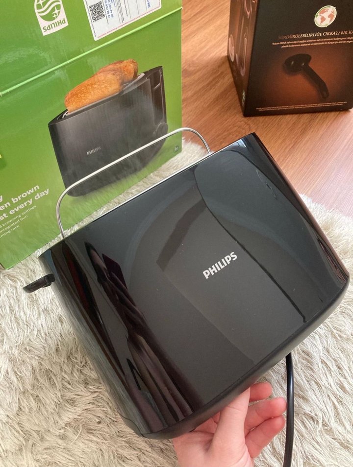 Philips siyah ekmek kızartma makinesi, sağlam tutma sapı ve kompakt boyutuyla ekmekleri eşit şekilde kızartır.