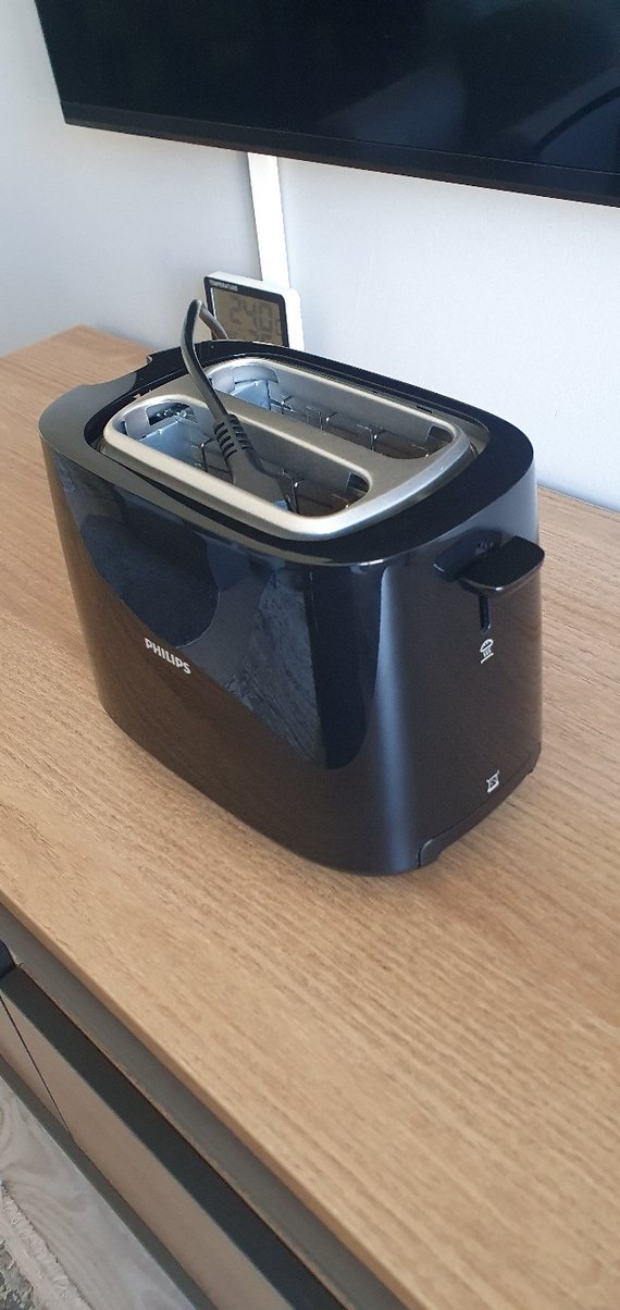 Philips marka siyah ekmek kızartma makinesi, iki dilim ekmek yuvası ve kolay kullanım için kol ile tasarlanmıştır.