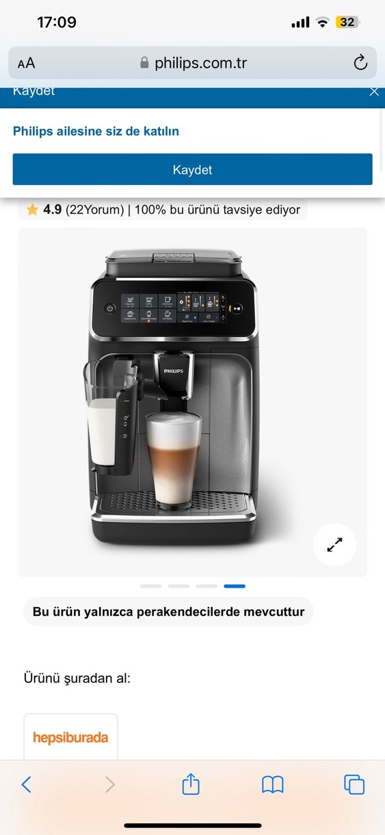 Philips siyah gri kahve makinesi, dijital ekran ve süt köpürtücü ile çeşitli kahve seçenekleri sunar. %100 müşteri tavsiyesiyle dikkat çeker. ☕