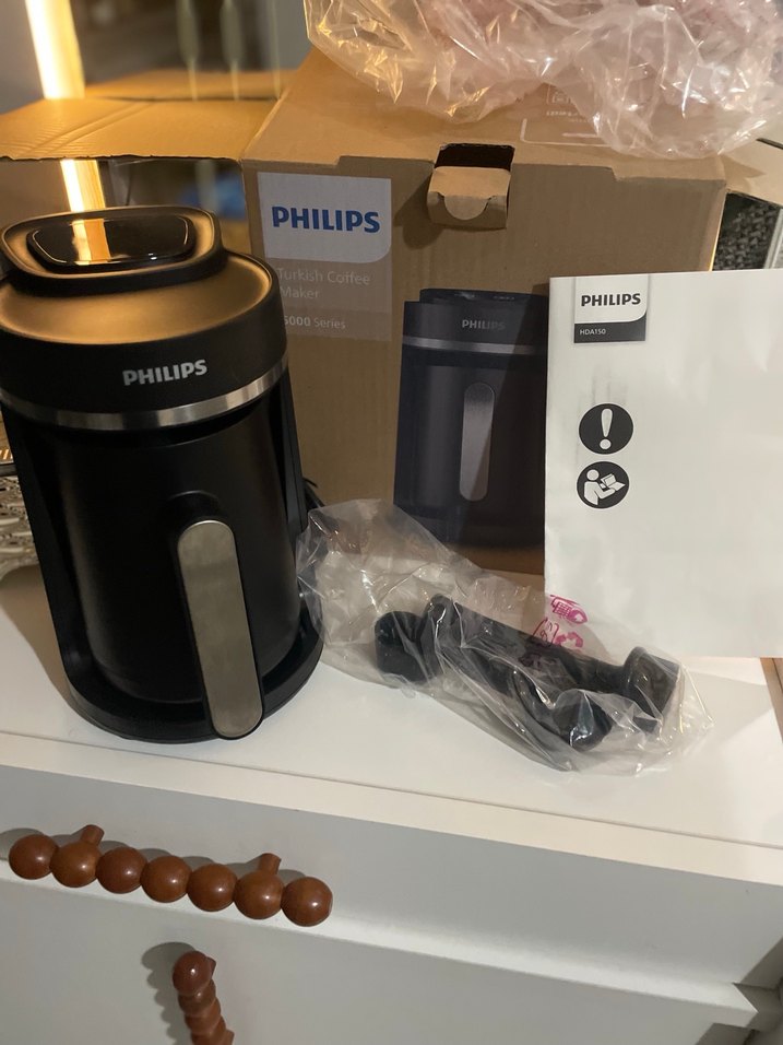 Türk kahve makinesi Philips siyah kahve değirmeni, kompakt tasarım ve metalik sap içerir. Güç kablosu ve kullanım kılavuzu dahildir. ☕ #Philips #Kahve #makinesi