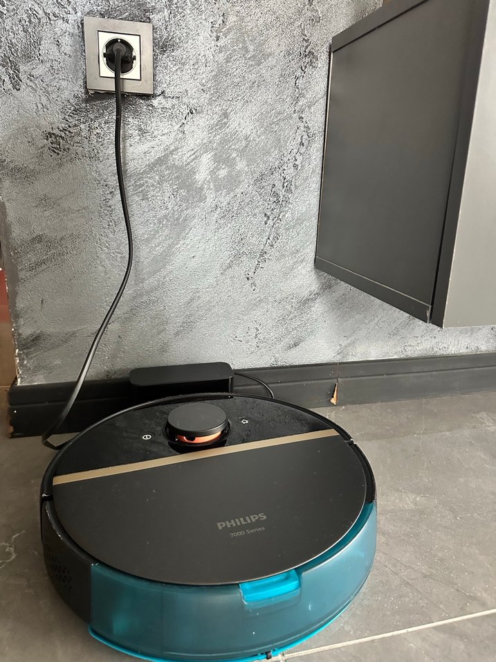 Philips marka siyah robot süpürge, mavi toz haznesi ve üstte kontrol düğmesi ile kullanımı kolaydır.