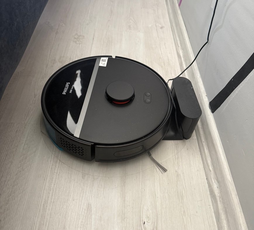 Philips siyah robot süpürge, şık tasarım ve otomatik şarj istasyonu ile pratik temizlik sağlar. Koyu renk ve kompakt yapıya sahiptir kutusu her şeyi duruyor yedek silme bezi vardır çeyize alındı 5 6 kez anca kullanıldı