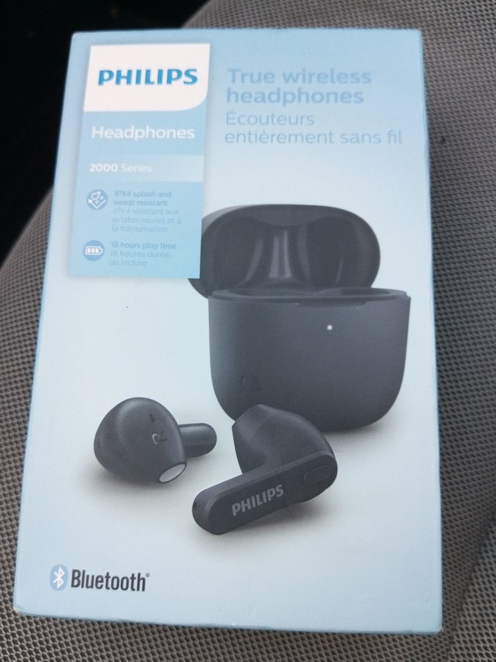 Philips siyah true wireless Bluetooth kulaklıklar, şarj kutusuyla birlikte. 18 saate kadar çalma süresi ve IPX4 sıçrama koruması sunar. Rahat kullanım sağlar.